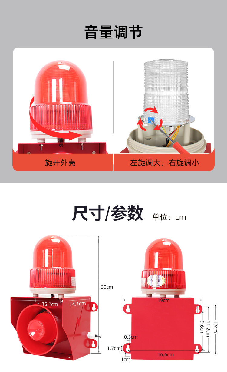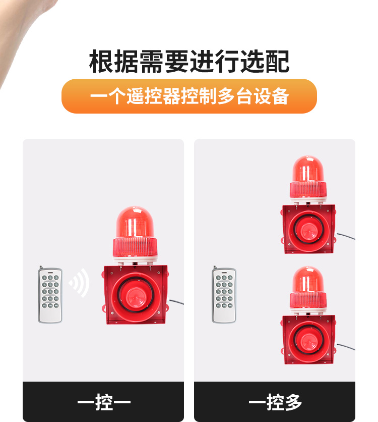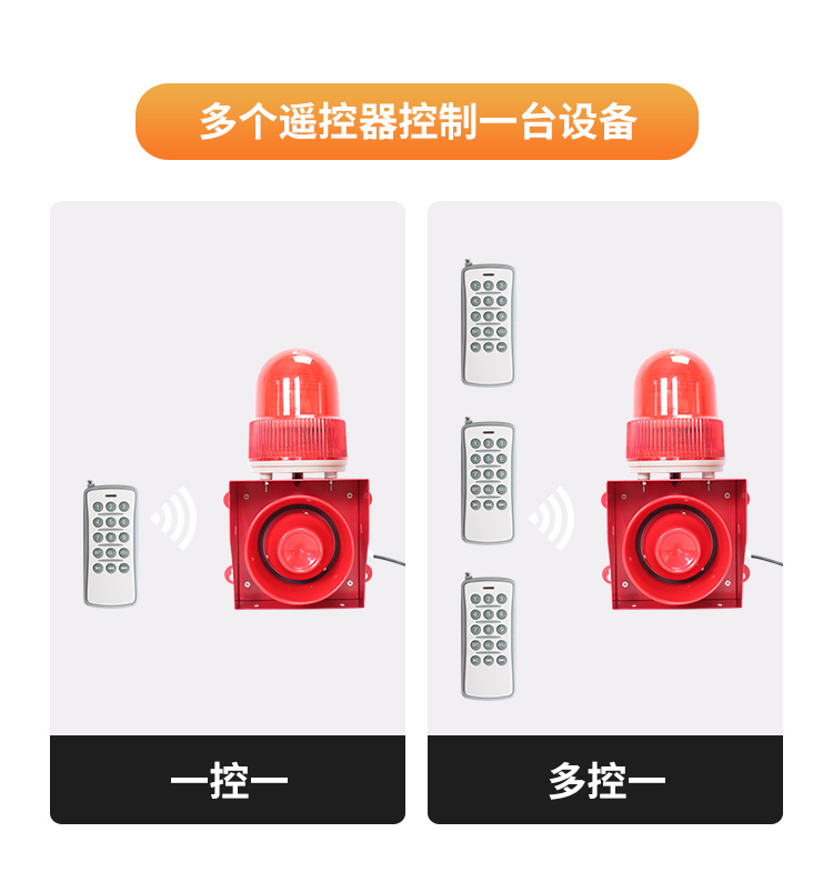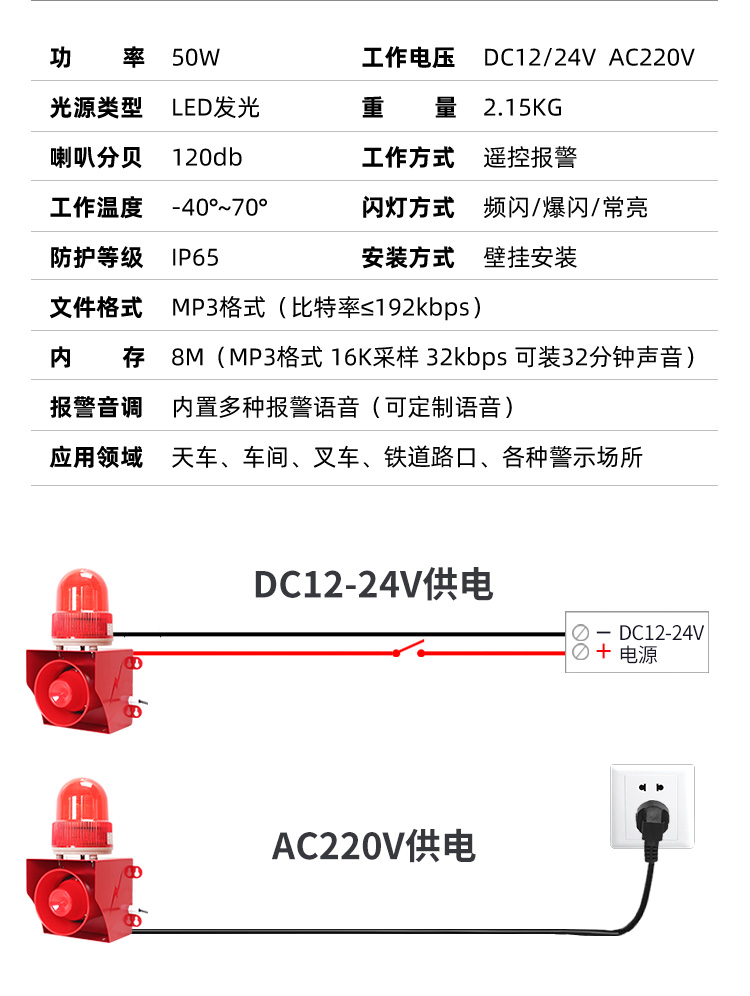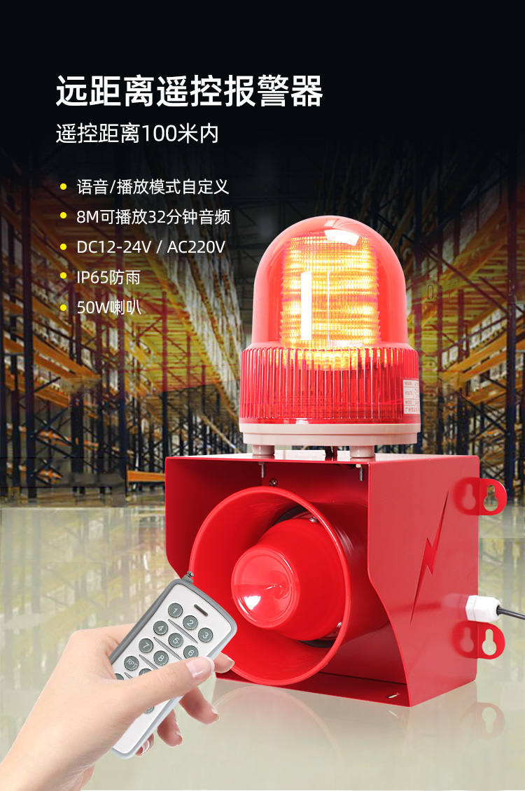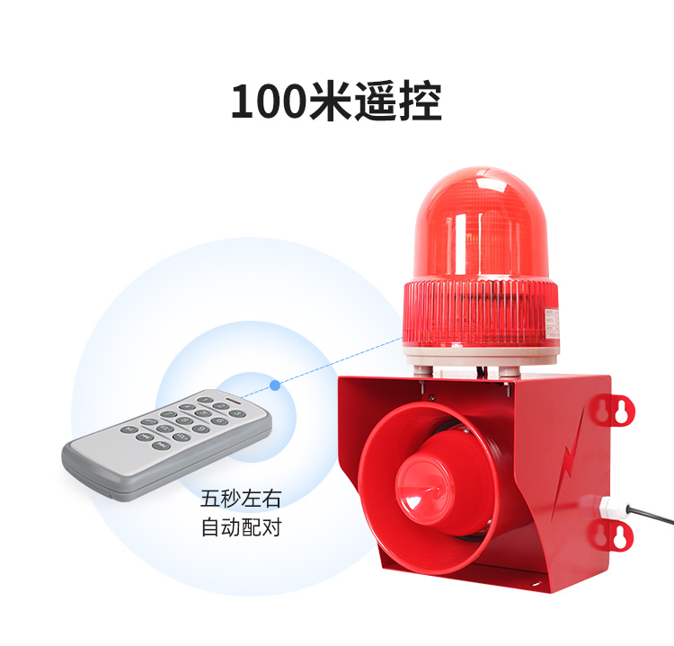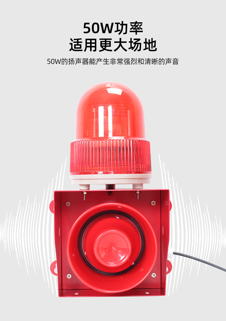 50W户外声光报警器433遥控款远距离控制播报,可AC220V/DC12-24V供电,自定义语音声光报警,灯光可设常亮,慢闪,爆闪