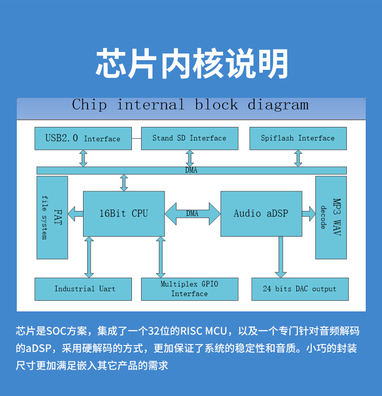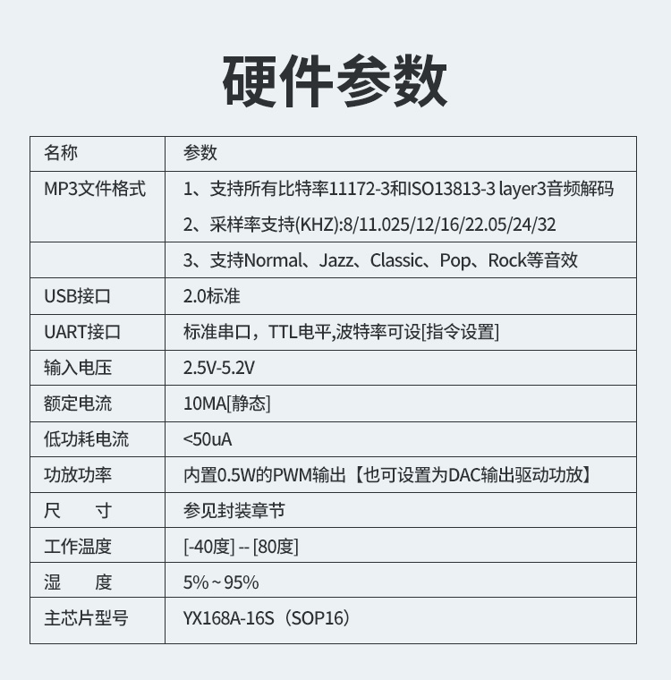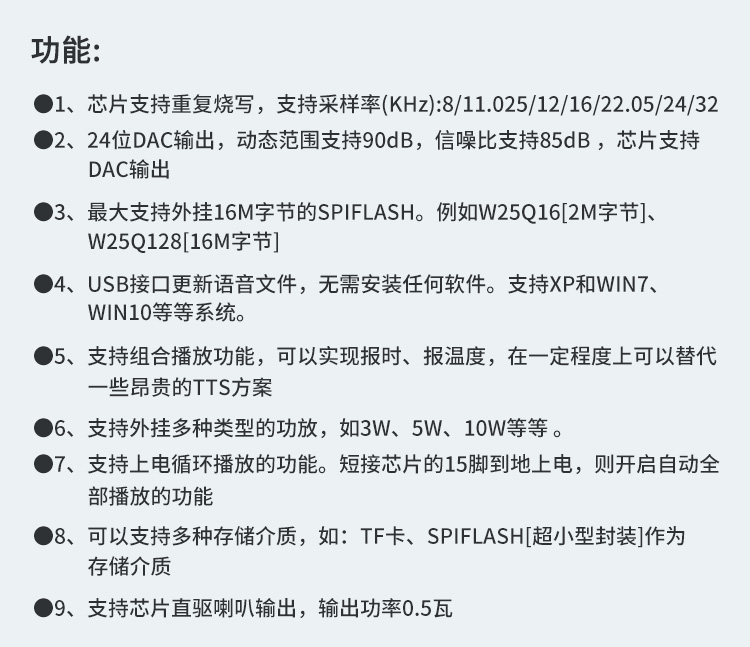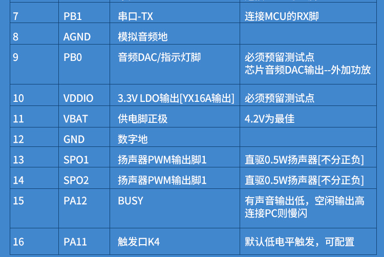 YX168A-16S是本公司新研发的一款语音芯片产品,它采用悦欣电子智能MP3音乐播放芯片为处理核心,支持使用FLASH芯片为存储器开发的语音播放器材,有1路开关量控制和TTL电平串口通信进行播放控制,具有操控简单,适用范围广,音质好、mp3文件掉电可长期储存等特点